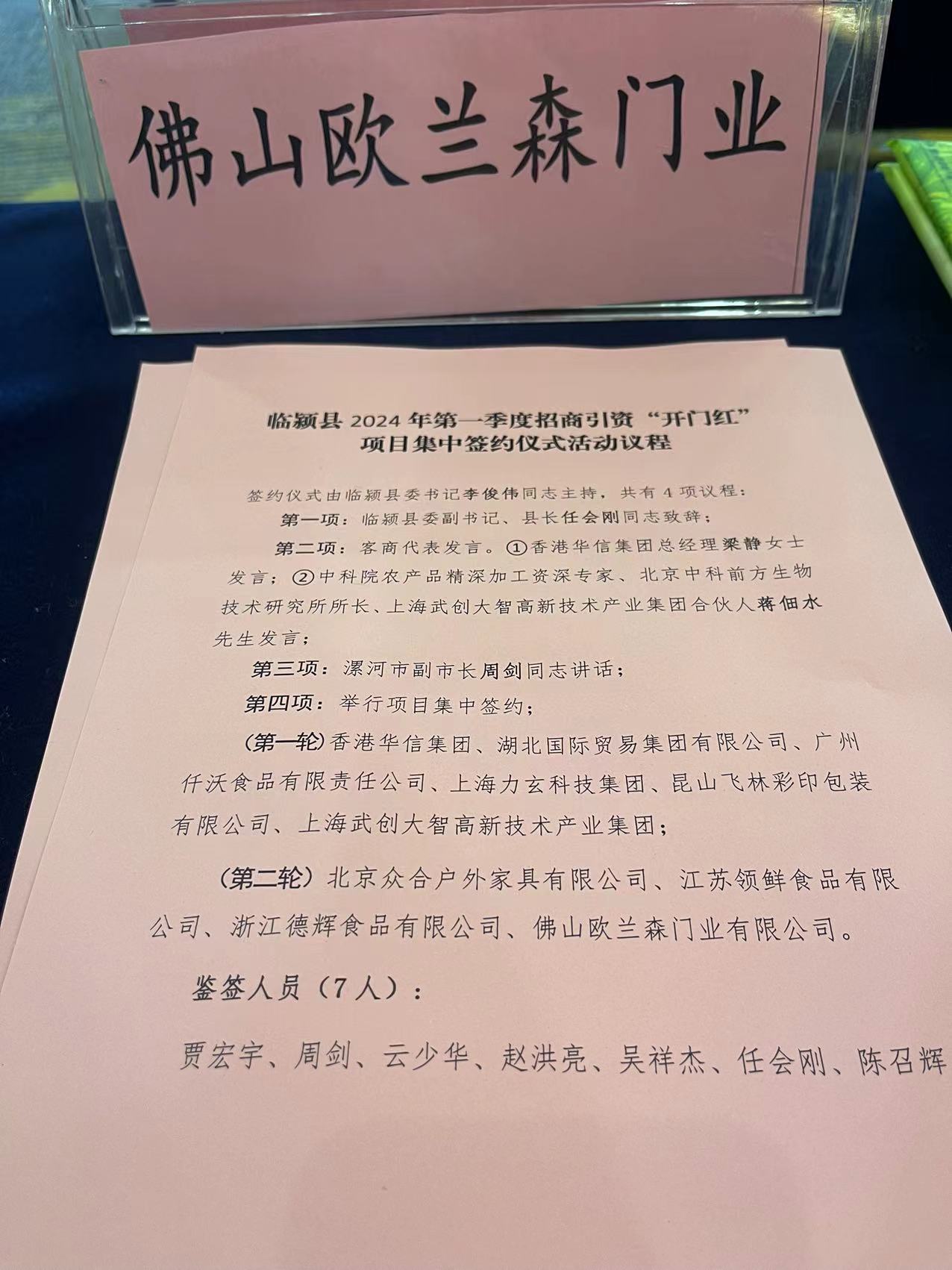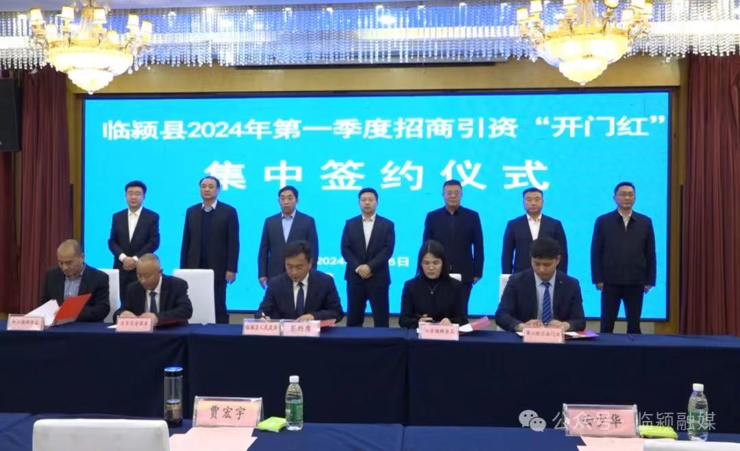 2月25日,臨潁縣舉行2024年第一季度招商引資“開門紅”項(xiàng)目集中簽約儀式,市委副書記賈宏宇、市政府副市長周劍,縣領(lǐng)導(dǎo)李俊偉、任會(huì)剛、陳召輝、李磊、王志敏、于勝洋及香港華信集團(tuán)、上海武創(chuàng)大智高新產(chǎn)業(yè)技術(shù)集團(tuán)、上海力玄科技、江蘇領(lǐng)鮮食品等10家企業(yè)負(fù)責(zé)人,市直、縣直及項(xiàng)目服務(wù)單位負(fù)責(zé)人參加簽約儀式。